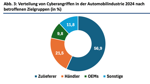 Abb.: Verteilung von Cyberangriffen in der Automobilproduktion 2024 nach betroffenen Zielgruppen (in %). Quelle: VicOne: Shifting Gears: Automotive Cybersecurity Report 2025, S. 16 / Grafik CAM“