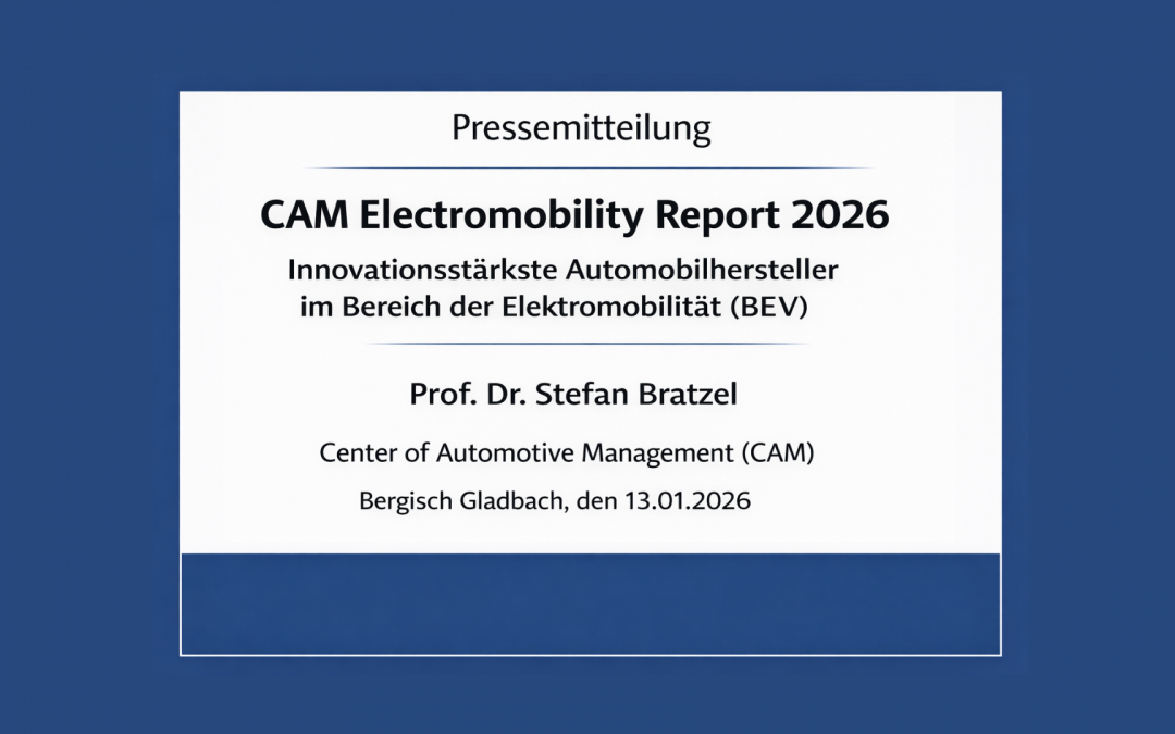 Der CAM Electromobility Report analysiert regelmäßig die aktuellen Markt-, Absatz- und Innovationstrends der Elektromobilität in wichtigen Kernmärkten (z.B. China, USA, Europa und Deutschland). Gleichzeitig werden die wesentlichen Einflussfaktoren auf den Markthochlauf der Elektromobilität empirisch beleuchtet. Die Untersuchung konzentriert sich auf reine Batteriefahrzeuge (BEV) und Plug-In-Hybride (PHEV / REEX). Weitere Informationen: https://auto-institut.de/e-mobility/
