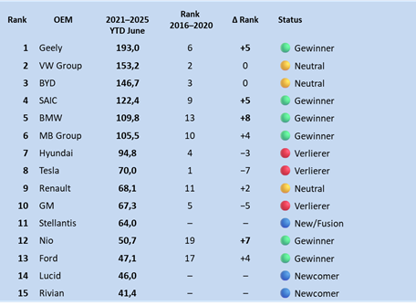 Aber auch die deutschen Automobilhersteller können die Innovationsstärke im Bereich Elektromobilität in den letzten Jahren deutlich steigern und etablieren sich zunehmend als zweitstärkste Kraft: Nach einer moderaten Position in den Jahren 2022–2024 nimmt der deutsche Innovationsanteil bis zum im ersten Halbjahr 2025 deutlich zu und erreicht rund ein Drittel der globalen Elektro-Innovationsstärke. Neben der VW Group, die weiterhin stabil auf Rang 2 rangiert, machen BMW und Mercedes im Periodenvergleich ein Sprung um 8 bzw. 4 Plätze nach vorn.