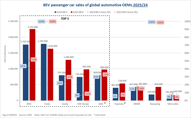Die globalen Absatzzahlen batterieelektrischer Pkw (BEV) zeigen im Jahr 2025 eine weiterhin positive Marktentwicklung, allerdings mit deutlichen Unterschieden zwischen den führenden Automobilherstellern. Die fünf absatzstärksten OEMs – BYD, Tesla, Geely, VW Group und SAIC – vereinen im Jahr 2025 mit rund 7 Mio. Pkw den Großteil der weltweiten BEV-Pkw-Verkäufe auf sich (vgl. Abb. 3).