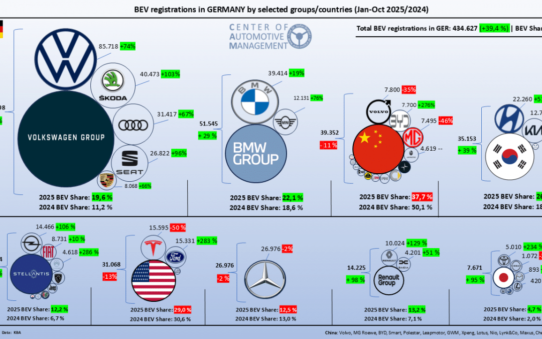 Koreanische Hersteller (Hyundai & Kia) verbesserten sich mit 35.153 BEVs (+39 %) ebenfalls deutlich. Ihr BEV-Anteil erhöhte sich von 18,0 % auf 26,5 %, unterstützt durch wettbewerbsfähige Modelle und eine stabile Marktpräsenz.