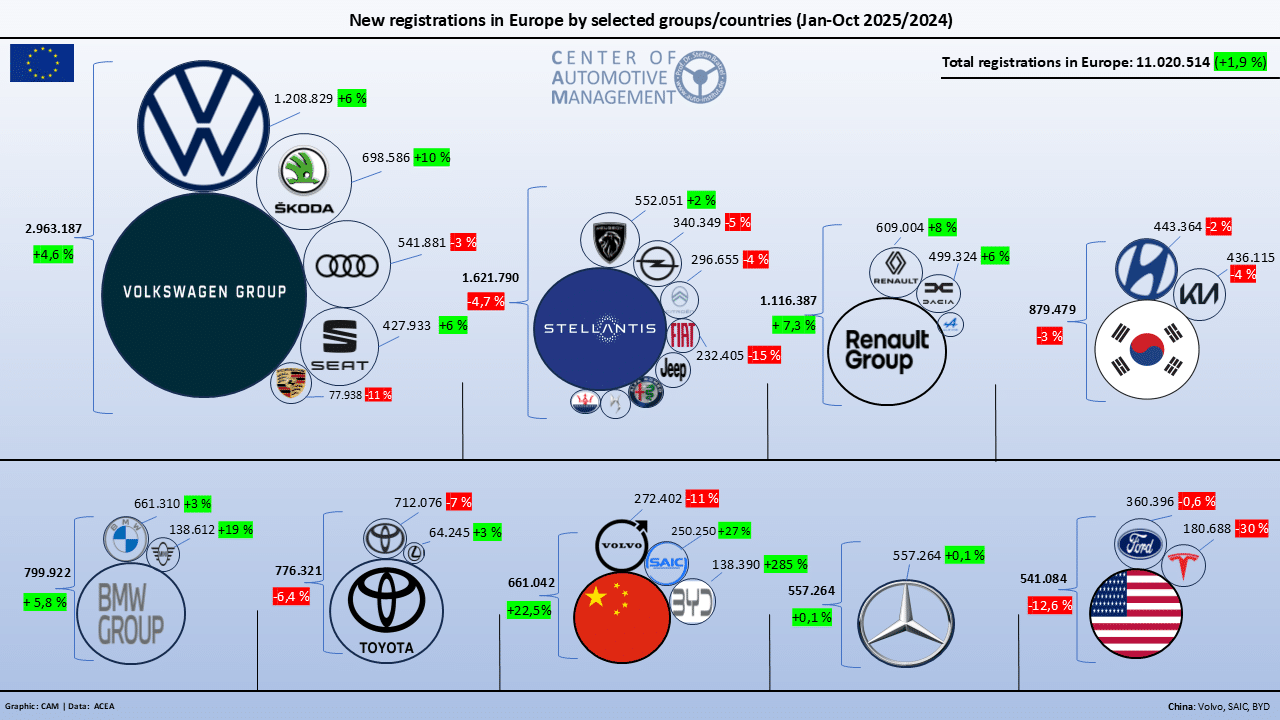 Abbildung 2: Neuzulassungen der wichtigsten Automobilhersteller in Europa bei allen Antrieben, Jan-Okt. 2025