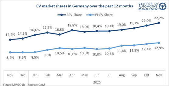 Der deutsche Markt für batterieelektrische Fahrzeuge (BEV) wächst weiterhin dynamisch. Von Januar bis November 2025 wurden 490.368 BEVs neu zugelassen – ein Plus von +41,3 % gegenüber dem Vorjahreszeitraum. Der BEV-Anteil an den Pkw-Neuzulassungen ist in den letzten 12 Monaten fast kontinuierlich von 14,4% auf 22,2% angestiegen und liegt nach 11 Monaten des laufenden Jahres bei 18,8%. Auch die PHEV-Quote ist nach ähnlichem Muster von 8,4 % auf nunmehr 12,9 % angestiegen und liegt im Jahr 2025 bei 10,8% (vgl. Abb. 3). Im Gesamtjahr 2025 rechnet das CAM mit BEV-Neuzulassungen von rund 530.000 Pkw, was etwas über dem bisherigen Rekordjahr 2023 liegt, das jedoch durch die damalige Umweltprämie geprägt war.